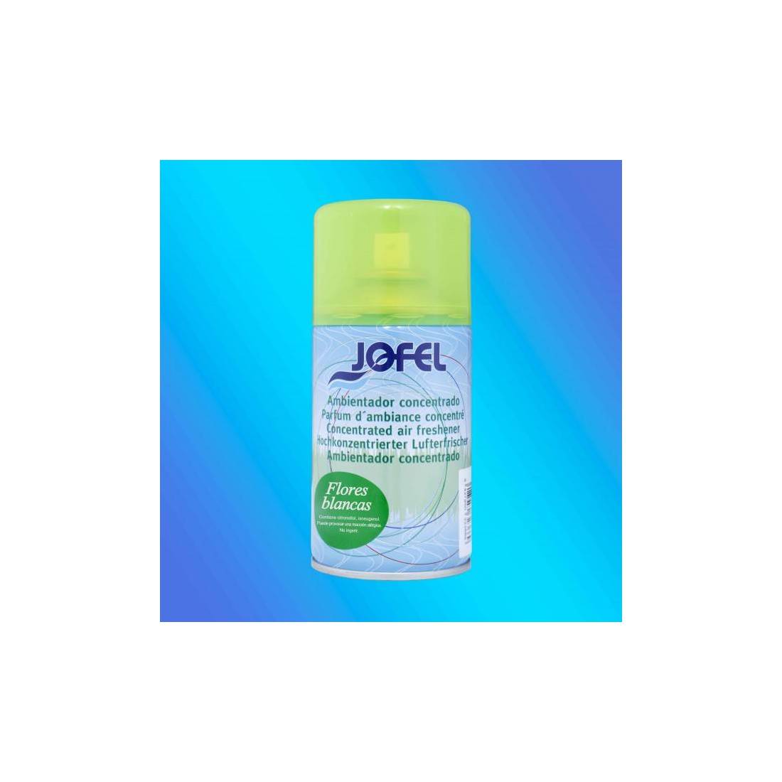 JofelAmbientador aerosol concentrado, perfume FLORES BLANCAS.\nAmbientador con alta concetración de perfume: 6%.\nEnvase metálico con válvula de seguridad que impide dispensación larga y continuada.\nP