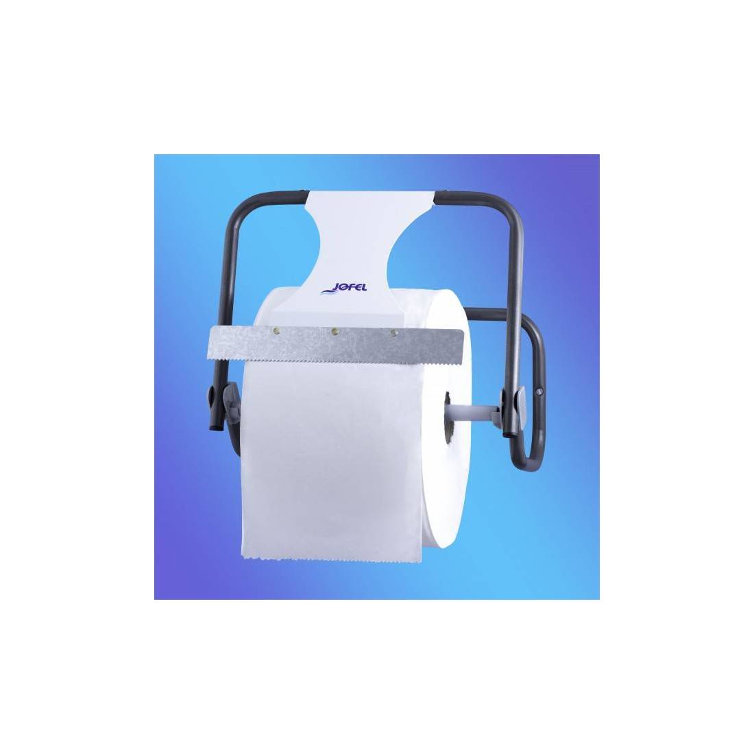 JofelDispensador de bobinas industriales de papel (máx. 500 mts.)\nChasis de tubo de acero de 20 mm. de diámetro.\nCon pintura electrostática poliéster.\nSierra metálica integrada pintada en Poliéster.