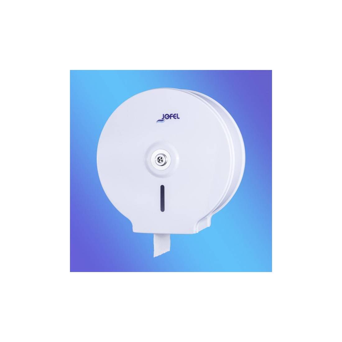JofelDispensador de papel rollo en continuo.\nChapa de acero electrocincada pintada en poliéster blanco.\nCerradura con llave central y visor de carga.\nAntivandálico.\nAdmite rollos de hasta 300 mts.