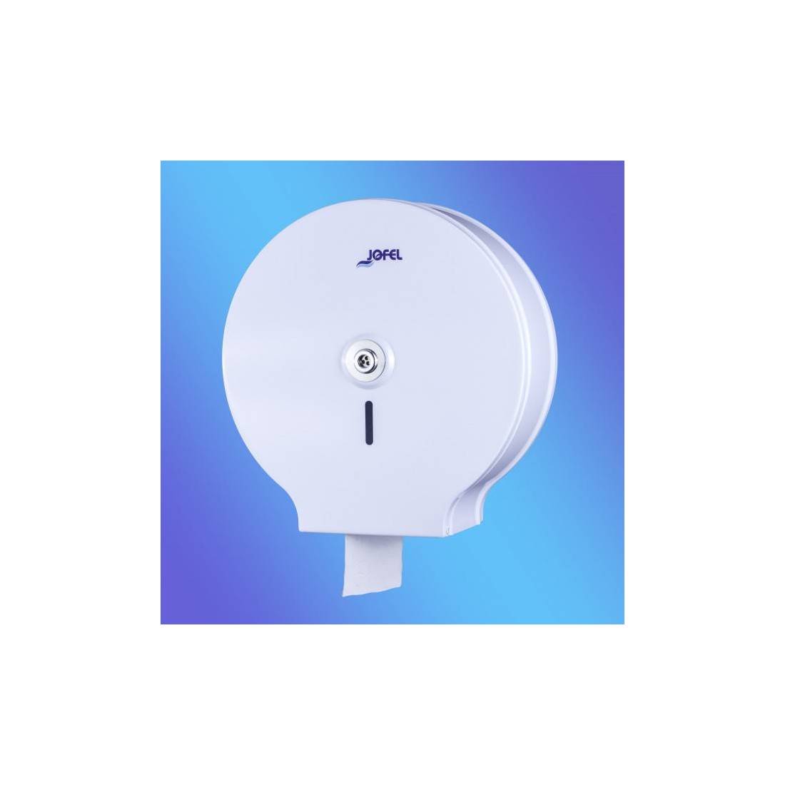 JofelDispensador de papel rollo en continuo.\nChapa de acero electrocincada pintada en poliéster blanco.\nCerradura con llave central y visor de carga.\nAntivandálico.\nAdmite rollos de hasta 400 mts.