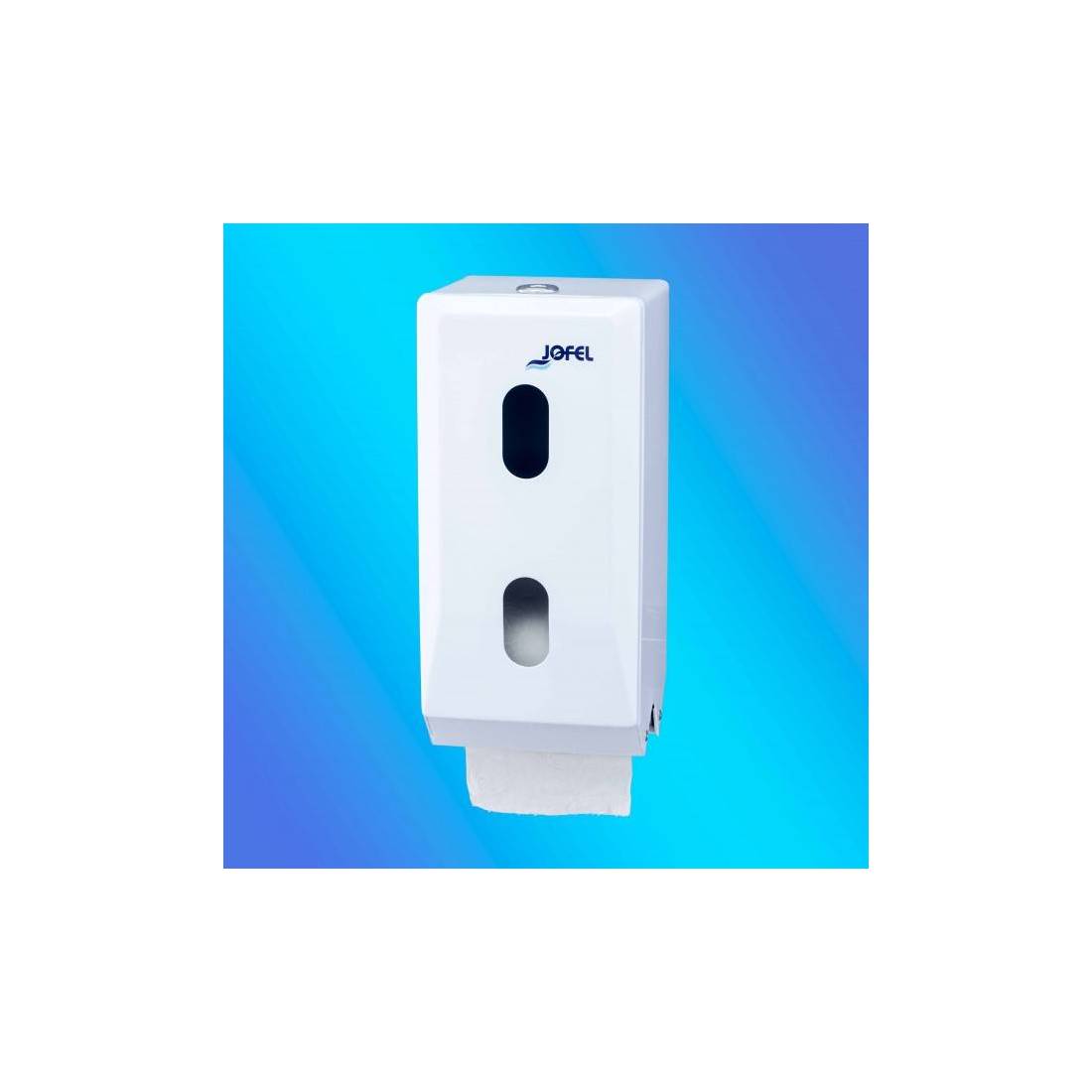 JofelDispensador papel higiénico doméstico en rollo. Admite 2 rollos.\nFabricado en chapa de acero electrocincada pintada en poliéster blanco.\nAntivandálico y frontal totalmente abatible para facilitar