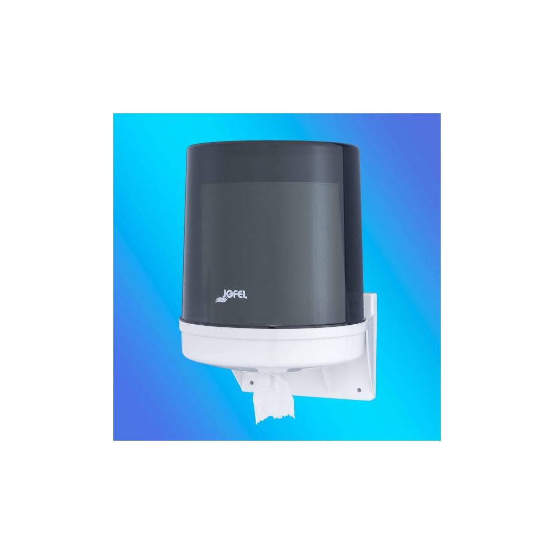 JofelDispensador Box de papel bobina mecha en continuo, dispensa por la base.\nBase en ABS blanco y vaso en “SAN” fumé.\nCerradura con llave y con forma ligeramente troncocónica.\nRequiere bobina espec