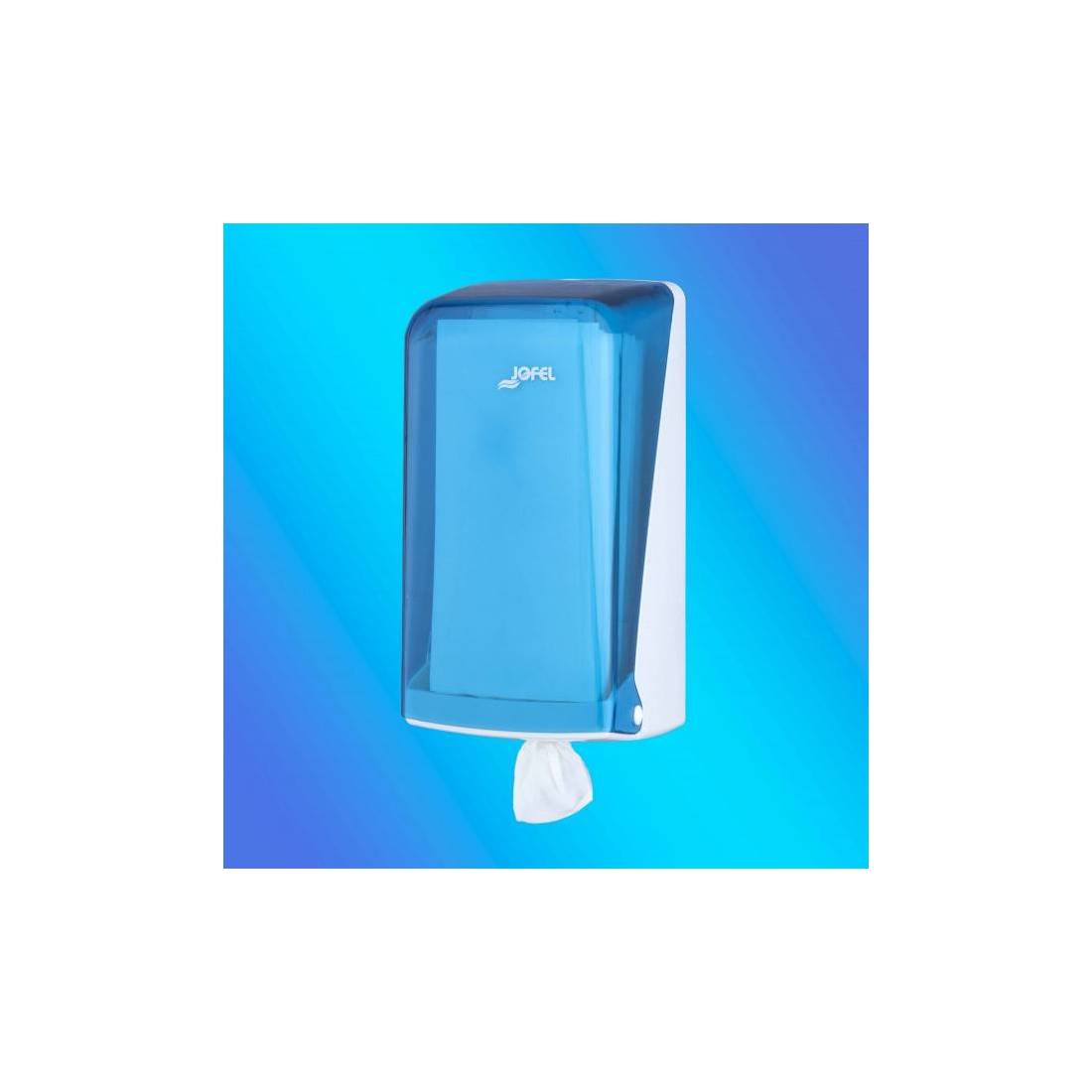JofelDispensador Mini Box de papel bobina mecha en continuo.\nSoporte fabricado en ABS blanco y frontal en “SAN” azul de alta calidad y resistencia.\nCerradura con llave y de forma rectangular integrada