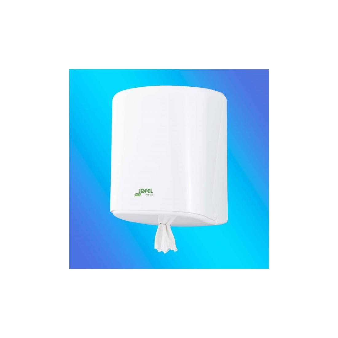 JofelDispensador Box de papel bobina mecha en continuo, dispensa por la base.\nFabricado en ABS blanco antibacteriano/higienizador de alta calidad y resistencia.\nFrontal totalmente abatible para facili