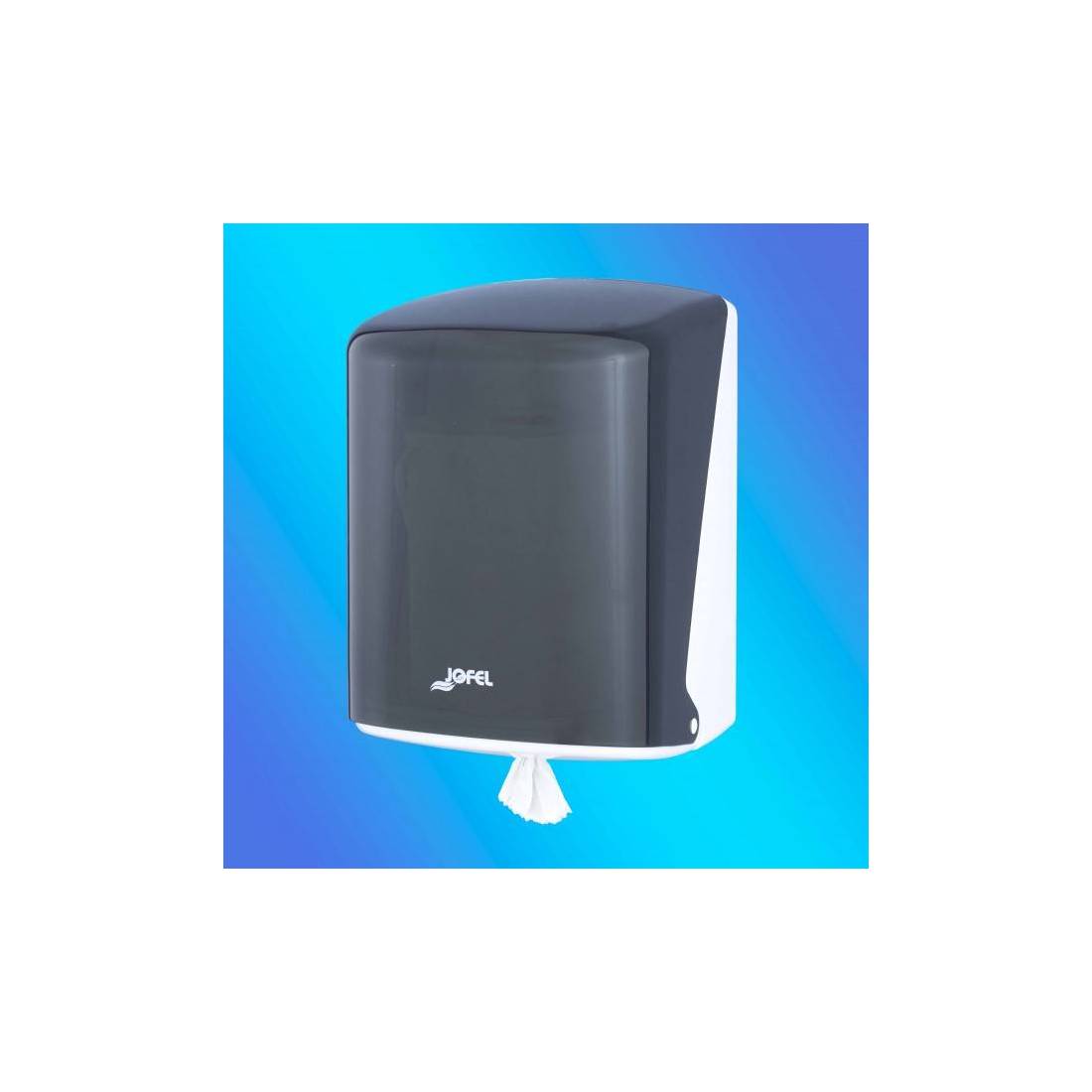 JofelDispensador Box de papel bobina mecha en continuo, dispensa por la base.\nSoporte en ABS blanco y frontal “SAN” fumé de alta calidad y resistencia.\nFrontal totalmente abatible para facilitar carga