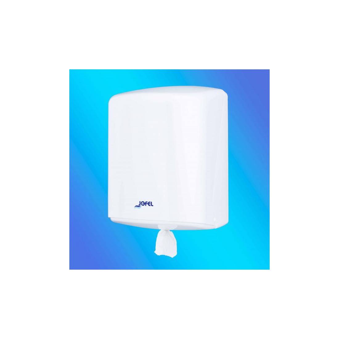 JofelDispensador Box de papel bobina mecha con precorte, dispensa por la base.\nFabricado en ABS blanco de alta calidad y resistencia.\nFrontal totalmente abatible para facilitar carga papel y cerradura