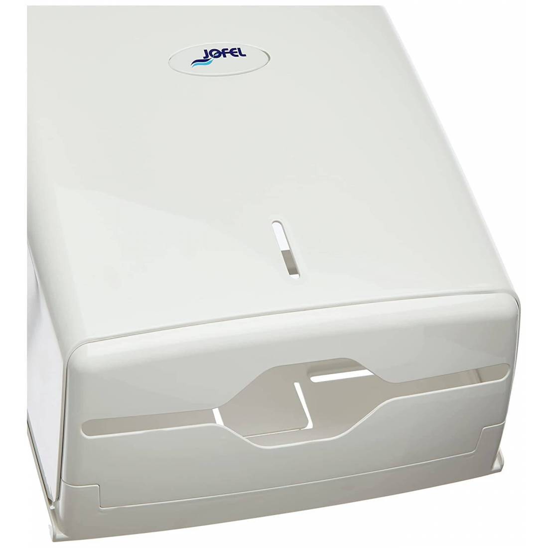 JofelDispensador de toallas formato zig-zag.\nFabricado en ABS blanco de alta calidad y resistencia.\nCerradura con llave, visor de carga de toallas y frontal abatible.\nAdmite hasta 600 toallas tipo z