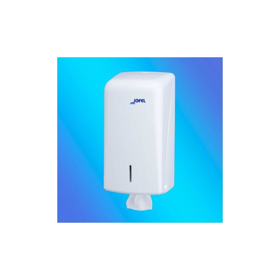 JofelDispensador de papel higiénico formato zig-zag.\nFabricado en ABS blanco de alta calidad y resistencia.\nCerradura con llave, visor de carga y frontal abatible.\nAdmite hasta 400 servicios zig-zag