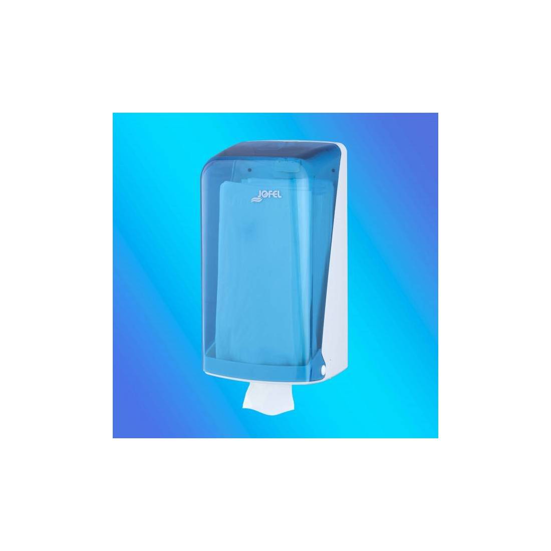 JofelDispensador de papel higiénico formato zig-zag.\nSoporte en ABS blanco y frontal en 'SAN' azul de alta calidad y resistencia.\nCerradura con llave y frontal abatible.\nAdmite hasta 400 servicios z