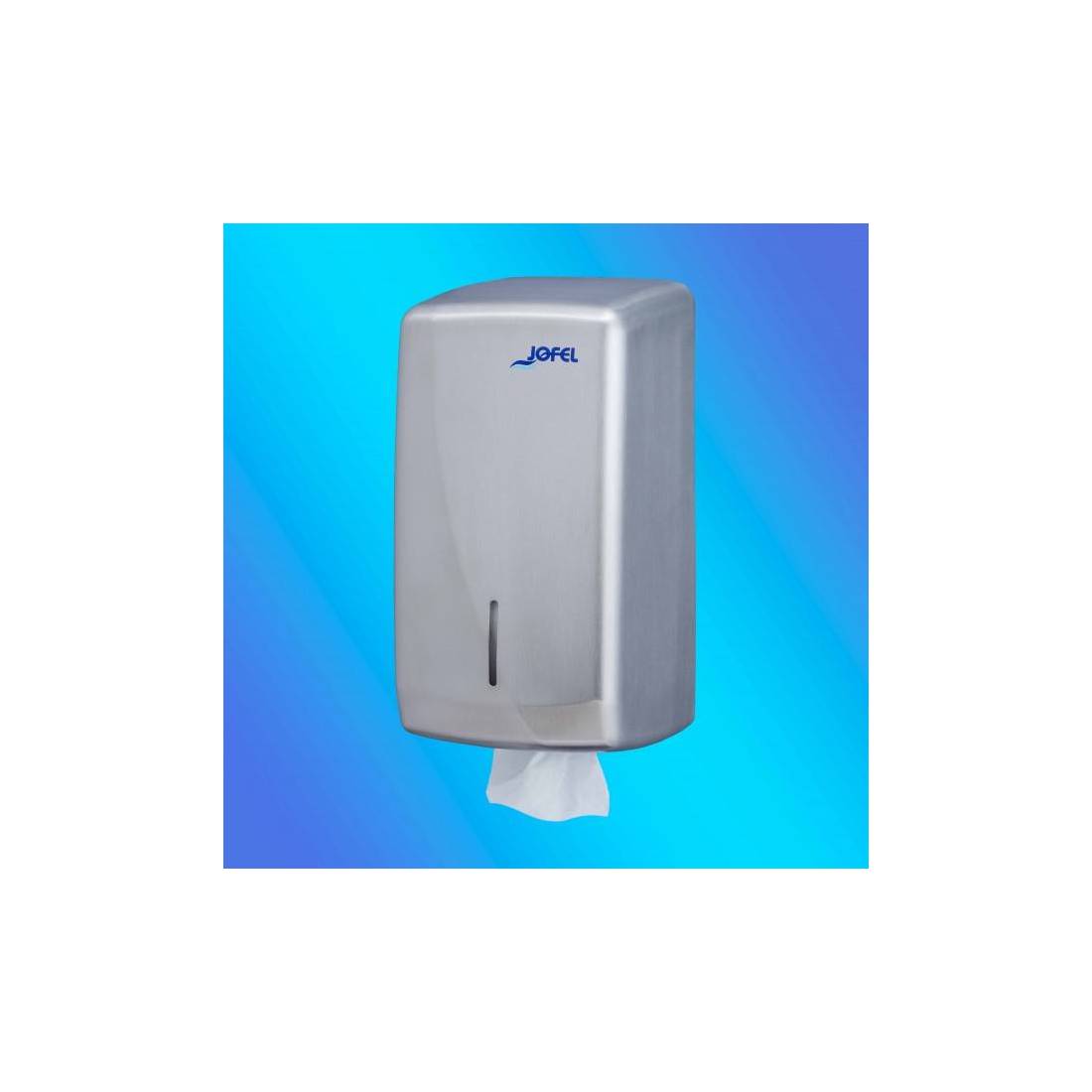 JofelDispensador de papel higiénico formato zig-zag.\nFabricado en acero inox. satinado de alta calidad y resistencia, base fabricada en ABS.\nCerradura con llave, visor de carga y frontal abatible.\nA