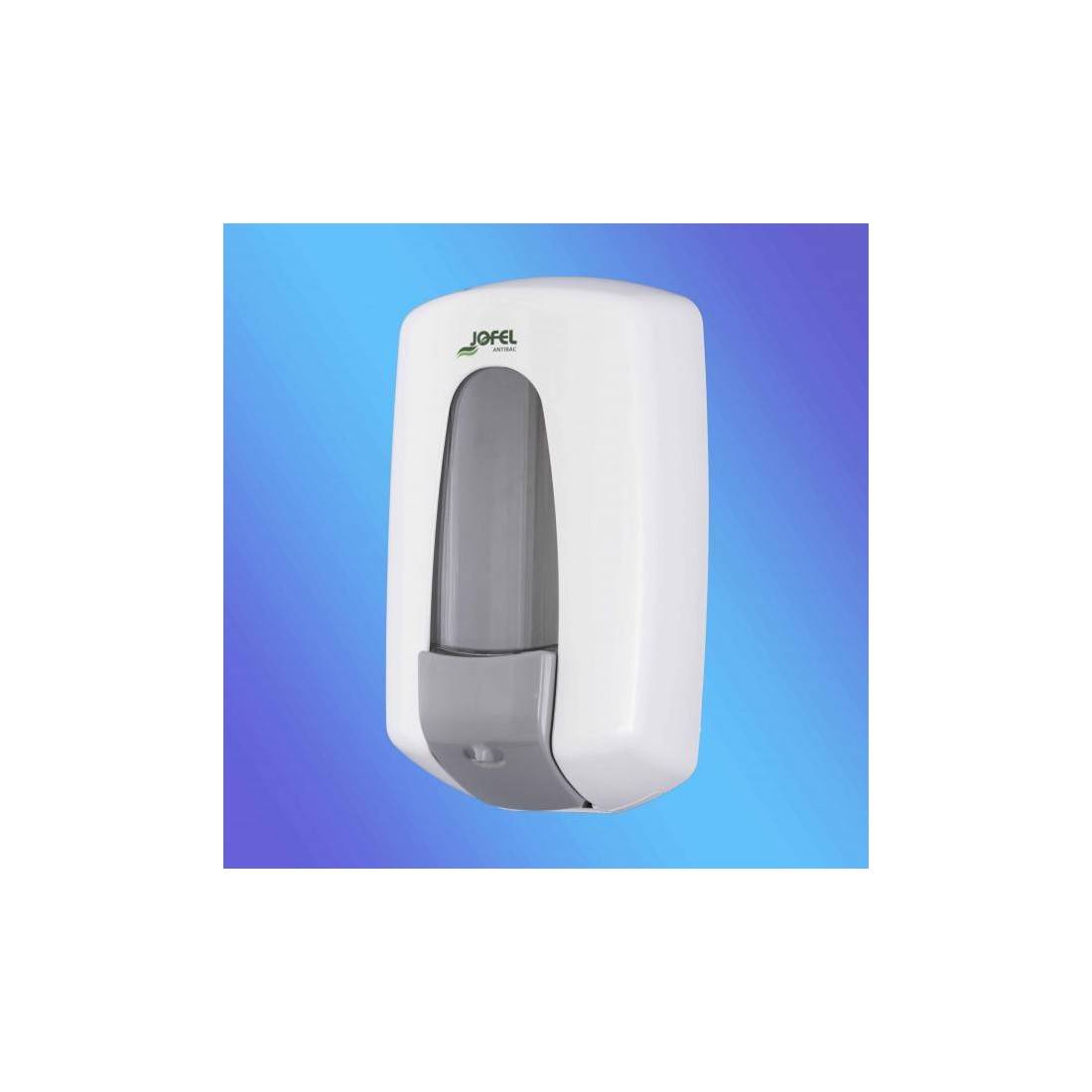 JofelDosificador de jabón líquido con depósito rellenable.\nDepósito transparente en SAN de 0,900 Lts.\nCerradura con llave, carcasa y pulsador en ABS blanco antibacteriano/higienizador.\nPulsador con