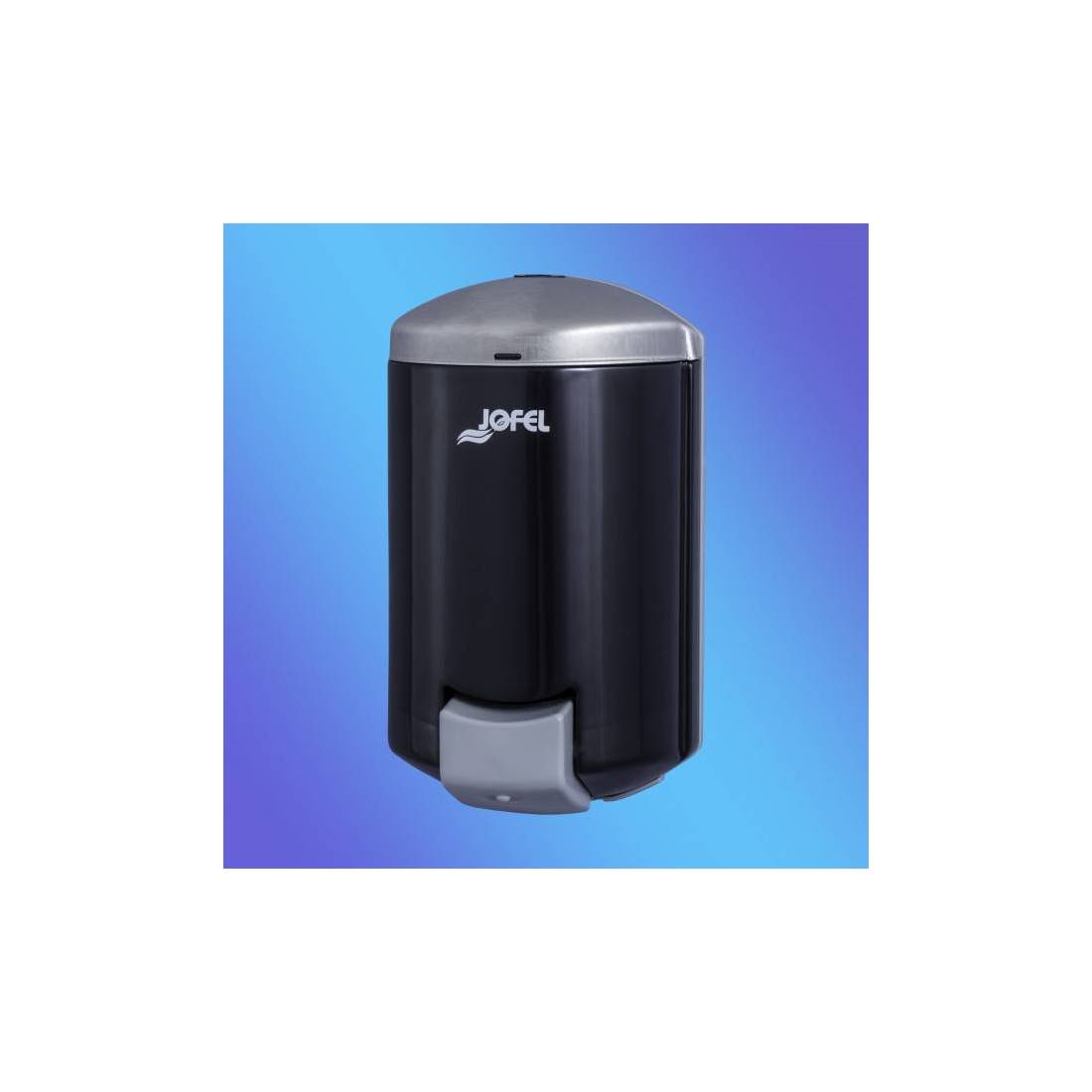 JofelDosificador de jabón líquido con depósito rellenable.\nDepósito en SAN Fumé de 0,900 Lts.\nBase y pulsador en ABS gris de alta calidad y resistencia.\nCerradura con llave y tapa de acero inox.\nP