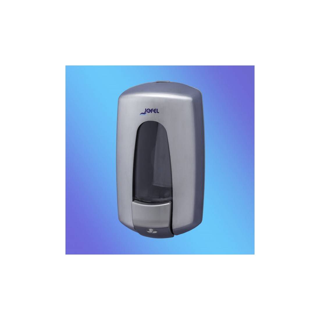 JofelDosificador de jabón líquido con depósito rellenable.\nDepósito transparente en SAN de 0,900 Lts.\nCarcasa en acero inox. satinado de alta calidad.\nCerradura con llave.\nPulsador con válvula ant